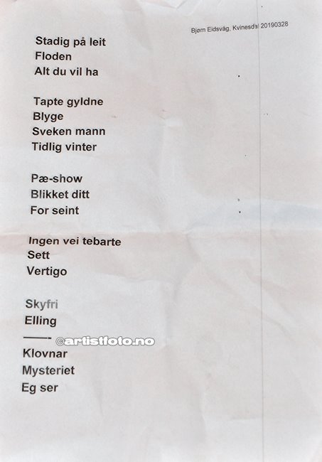 Bjørn Eidsvåg åpner konserten med sangen ”Stadig på leit” fra albumet ”Far faller”, og med fullt band blir dette en fantastisk flott åpning. Han spiller deretter ”Floden” og ” Alt du vil ha”.