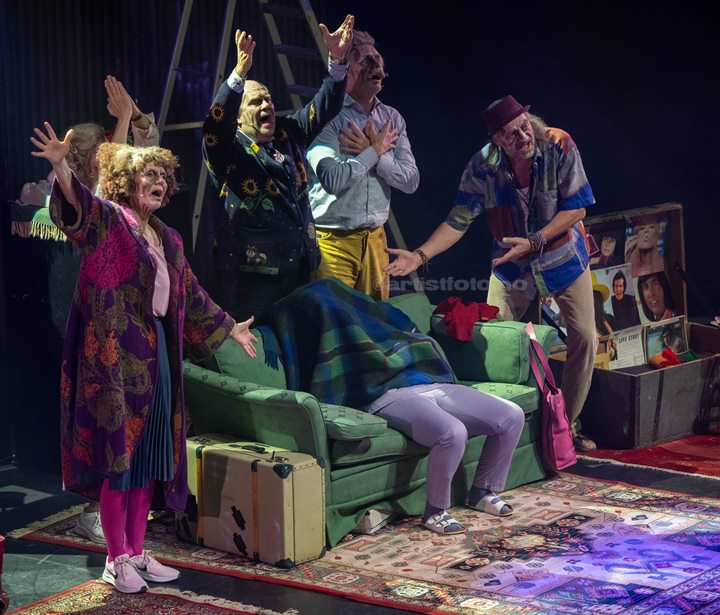 Det byrjar vilt og gale med skrantne pensjonistar som nesten ramlar av scena, og slagerrevyen vert villare og villare ettersom dagen på heimen skrid fram. Det er ikkje berre dei rynkesminka skodespelarane som er på kanten i kveld, her dreg dei humoren så langt dei berre kan utan at det hamnar heilt i grøfta