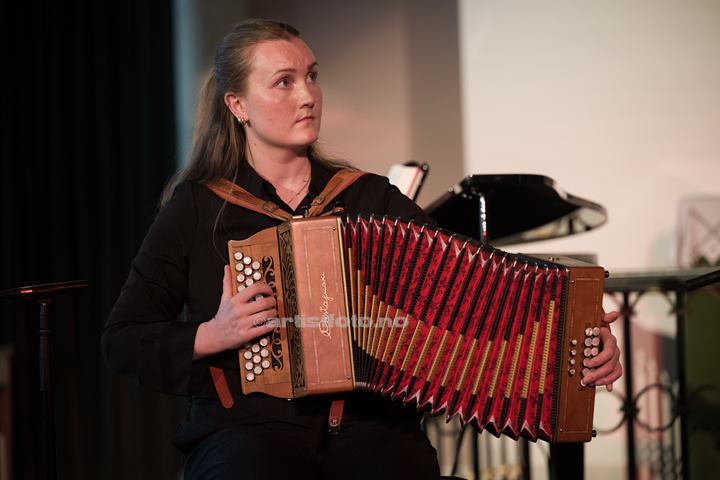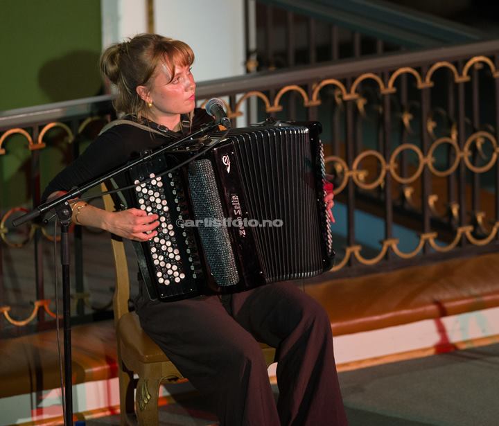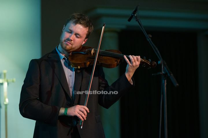 Martin Steinum Brun på vokal, Amalie Kinsarvik Tilde på trekkspel og Åsmund Farstad på fele opnar kyrkjekonserten. Dei er så samstemde og harmoniske at eg er sikker på at messingen i kyrkjeorgelet på galleriet summar med i lågstemt resonans. Martin med dei milde, blå augo synger så vent og kjenslefylt at det er som å stå i varmt sumarregn i kveldsvind. Amalie spelar med innleving og stemning, trampar takta sakte og sørgmodig. Folketonane frå fela fyller kyrkjerommet.
