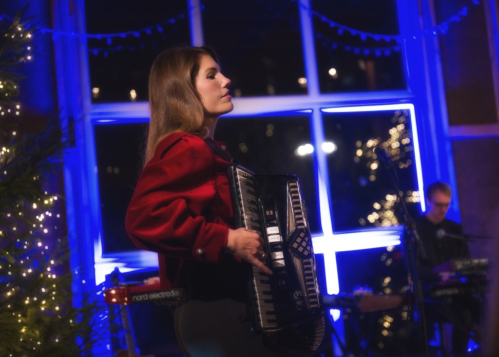 Denne gongen står ho på ein like utradisjonell scene litt lengre sør i kommunen: På loftet i den gigantiske, julepynta, amerikansk-inspirerte driftsbygninga på Lindland Farm.